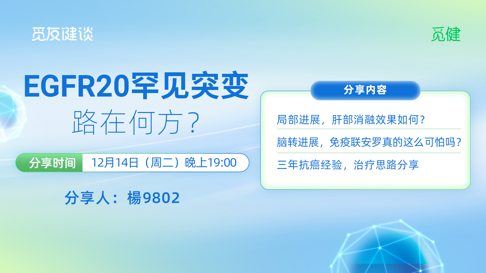 本期觅友健谈我们邀请到嘉宾楊9802,于12月14日(周二)晚7点带来EGFR20罕见突变的治疗经验分享,敬请期待。